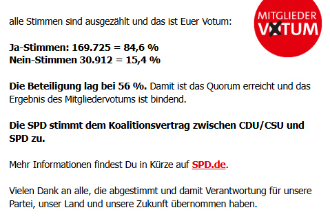 Aktuelles Aktuelles MITGLIEDERVOTUM ZUM KOALITIONSVERTRAG: 84,6% stimmen zu! Mehr Infos zur Regierungsbildung nächster Artikel →